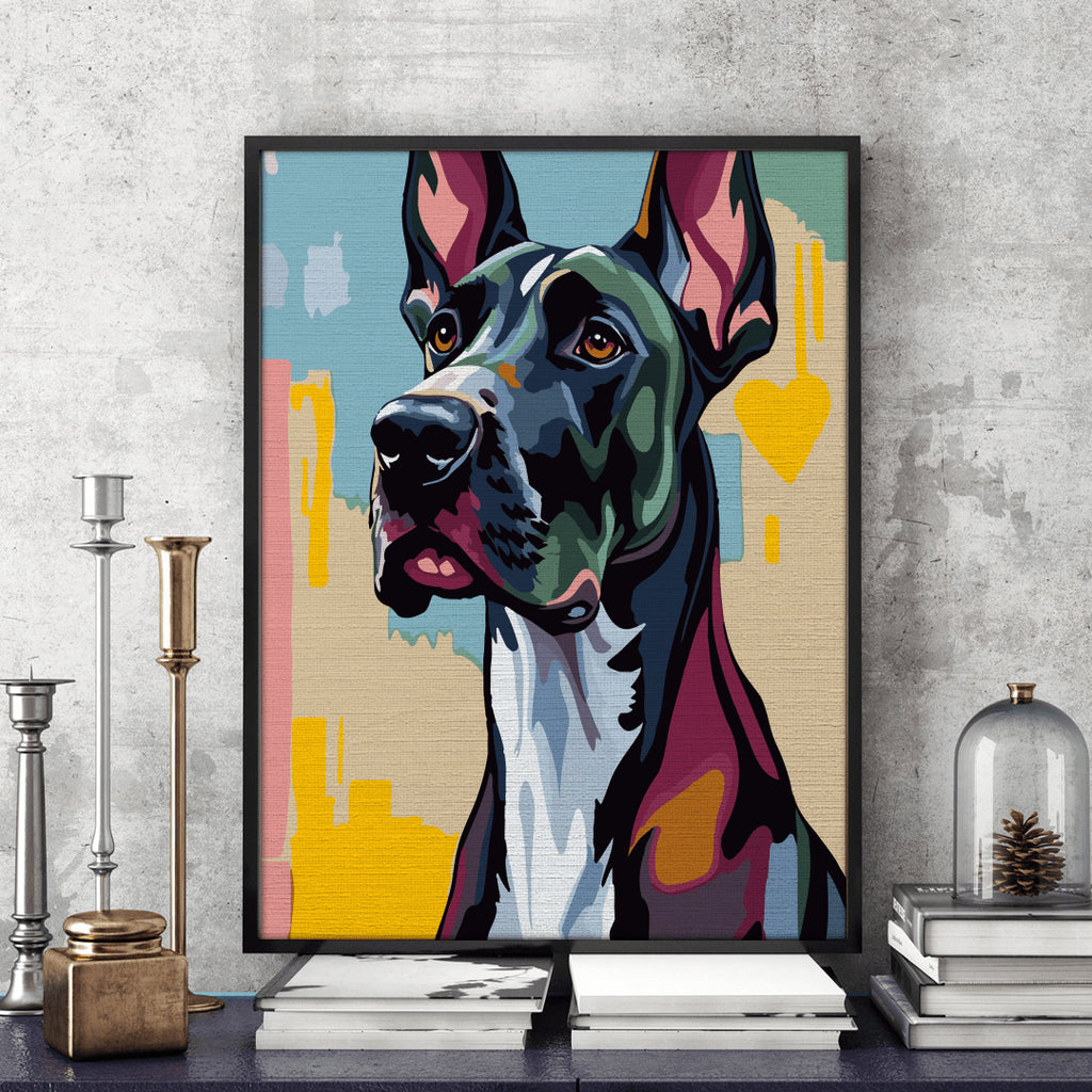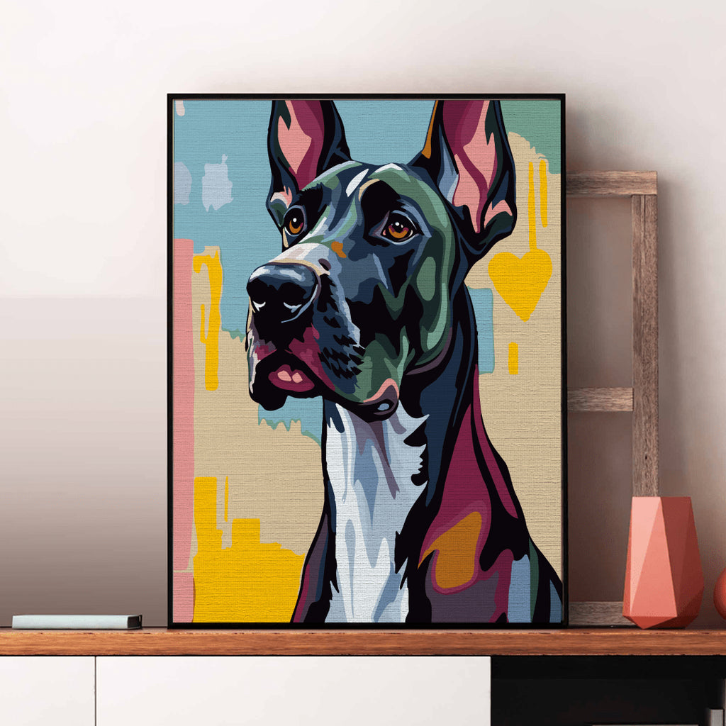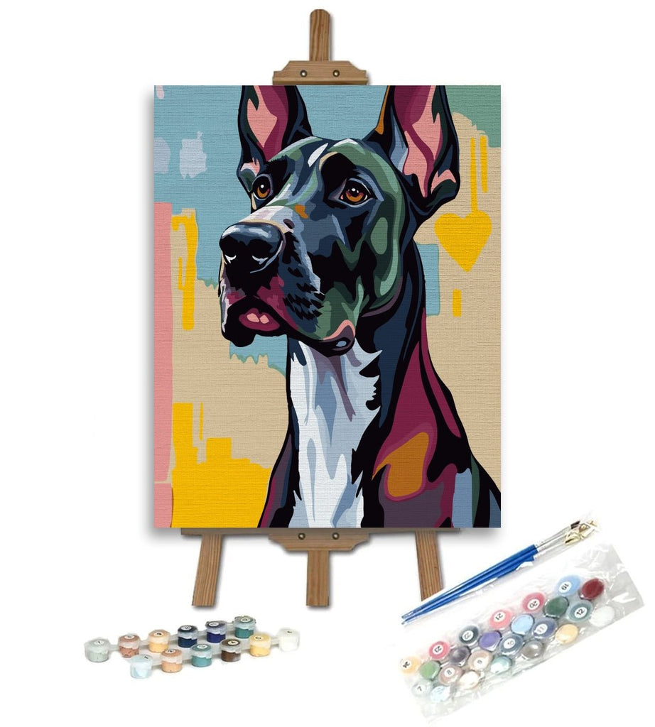 Pictura pe numere Dog German este portretul unui câine de această rasă impunătoare. Știați că despre acesta se spune că este Apollo al câinilor? Impresionează ca statură, dar și pentru că este afectuos.