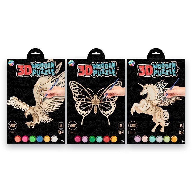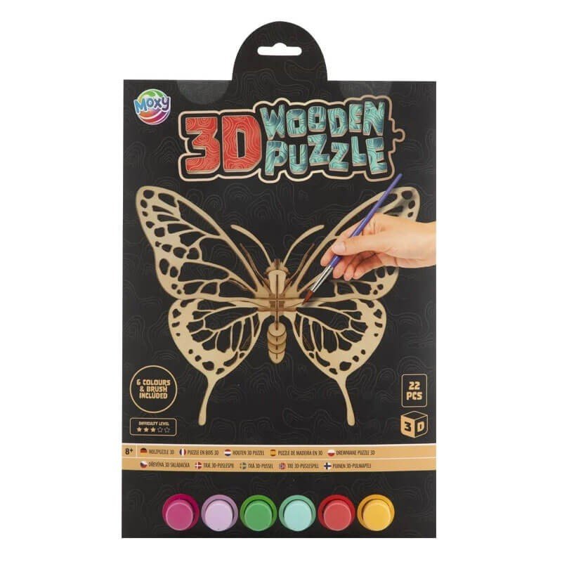 Încearcă un puzzle diferit, 3D. Creează un fluture cu ajutorul șabloanelor din lemn din pachet. Culorile incluse îți permit să pictezi fluturele așa cum îți place. O activitate creativă care se poate transforma într-un cadou special sau element decorativ.