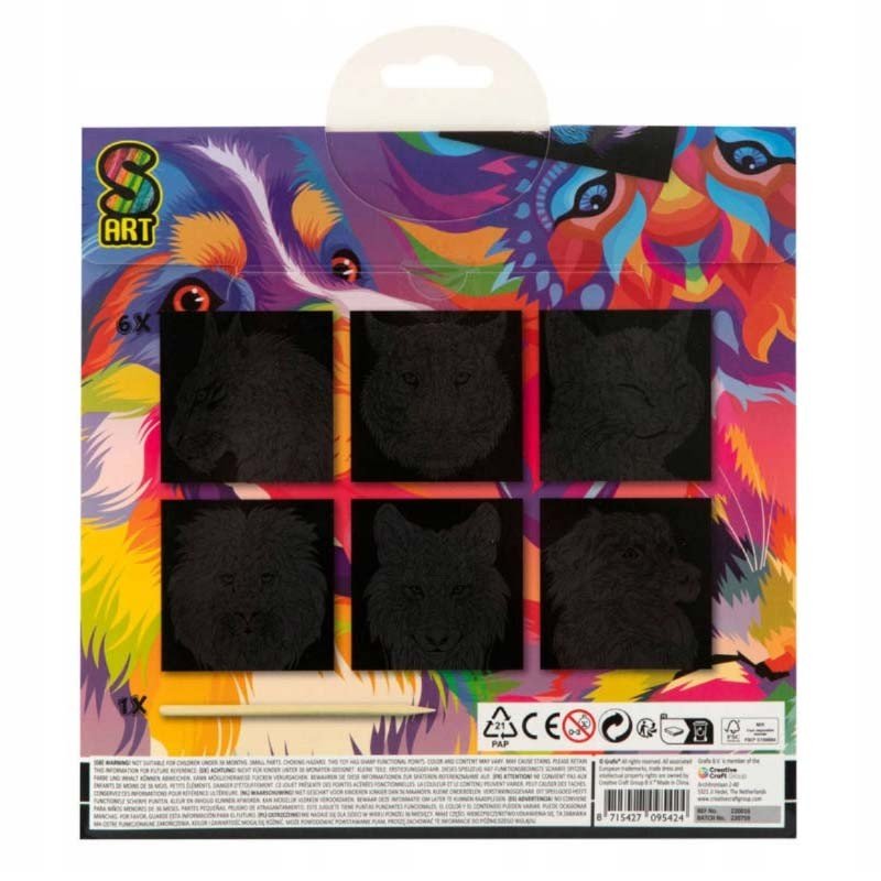 Acest set creativ cu tematică animal îmbină perfect artă cu descoperirea. Poate fi un proces de learning totodată. Fiecare planșă ascunde sub stratul negru o lume plină de culoare, animale colorate care prind viață pe măsură ce le razi ușor cu instrumentul inclus. 6 cartoane în total.