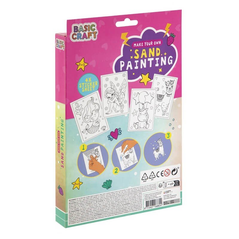 Setul conține: 4 x stickere motiv lamă, instrucțiuni, 12 x tuburi nisip colorat.